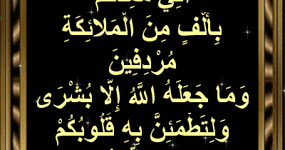 إ ذ ت س ت غ يث ون ر ب ك م ف اس ت ج اب ل ك م أ ن ي م م د ك م ب أ ل ف م ن ال م ل ائ ك ة م ر د ف ين و م ا ج ع ل ه الل ه إ ل ا ب ش ر ى و ل ت ط م ئ ن ب ه ق ل وب ك م و م ا الن ص ر إ ل ا م ن. قوله تعالى إذ تستغيثون ربكم فاستجاب لكم أني ممدكم بألف من الملائكة مردفين. إذ تستغيثون ربكم الاستغاثة. والاسم الغوث والغواث والغواث.